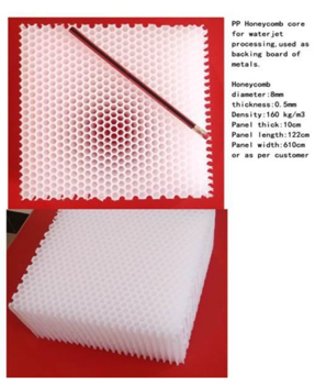 PTP-PPHC is a polypropylene honeycomb core sheet, which is made up of cylindrical tube straws bonded into a close packed hexagonal matrix, producing a high bulk density core material manufactured in a proprietary process. PTP-PPHC sheet, which could be used as bricks for water jet processing, is cheaper and more light weighted compared with standard bricks and it’s widely used all over the world. Just put the material sheet on top of the PP honeycomb core, when the water jet machine works, the high-pressured water cuts the metal and then the water flow passes through the honeycomb holes, this is very helpful to the cutter. The design of PTP-PPHC sheet the gives an even flat cutting surface and works well with abrasive and straight Water jet cutting.