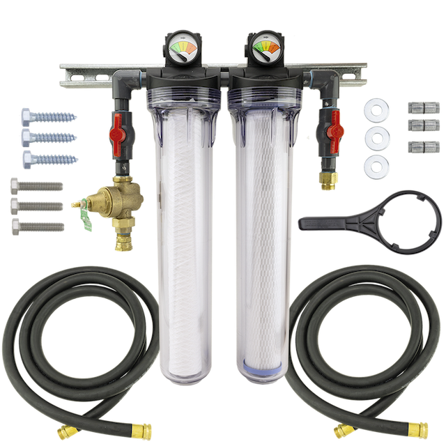 Filter Kit, Water, Incoming, Wall Mount, 2 filter This kit is used to reduce suspended solids, organics, and chlorine from the incoming water supply before entering the high-pressure pump. This wall mounted filter kit includes 1 each 1 micron filter, 1 each 3 micron filter, 2 each 10 ft. hoses, 1 each filter housing wrench, and mounting hardware.